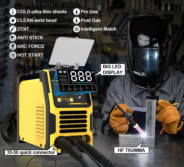 This machine integrates TIG welding and MMA manual welding functions, featuring a large LED display, a 35-50 quick connector, and other practical designs. It supports professional needs such as cold welding of ultra-thin plates and cleaning weld beads, and also boasts intelligent functions like anti-sticking and hot start. It is easy to operate and adaptable to various working conditions.